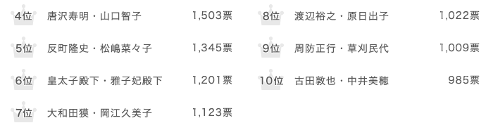 夫妻に投票した一般の方の声には、“美男美女の微笑ましい大人のカップル”“奥様は再婚でお子さんもいるが、そのお子さんに対して本当の親子以上に慈しみ合っている”“2001年度の24時間テレビ(NTV)で、家族を大切にするお二人に感激した”などがありました。