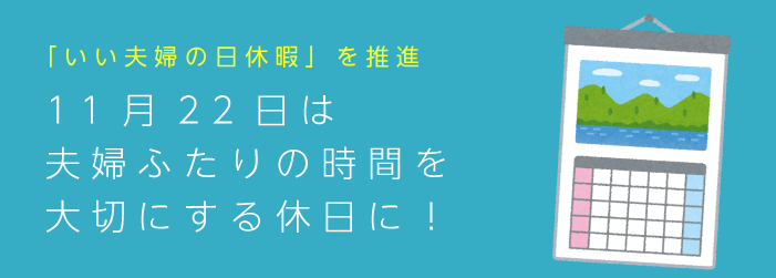 「いい夫婦の日」をすすめる会では、11月22日に休暇を取る「いい夫婦の日休暇」を提案し、協賛社・賛同団体と共に推進しております。